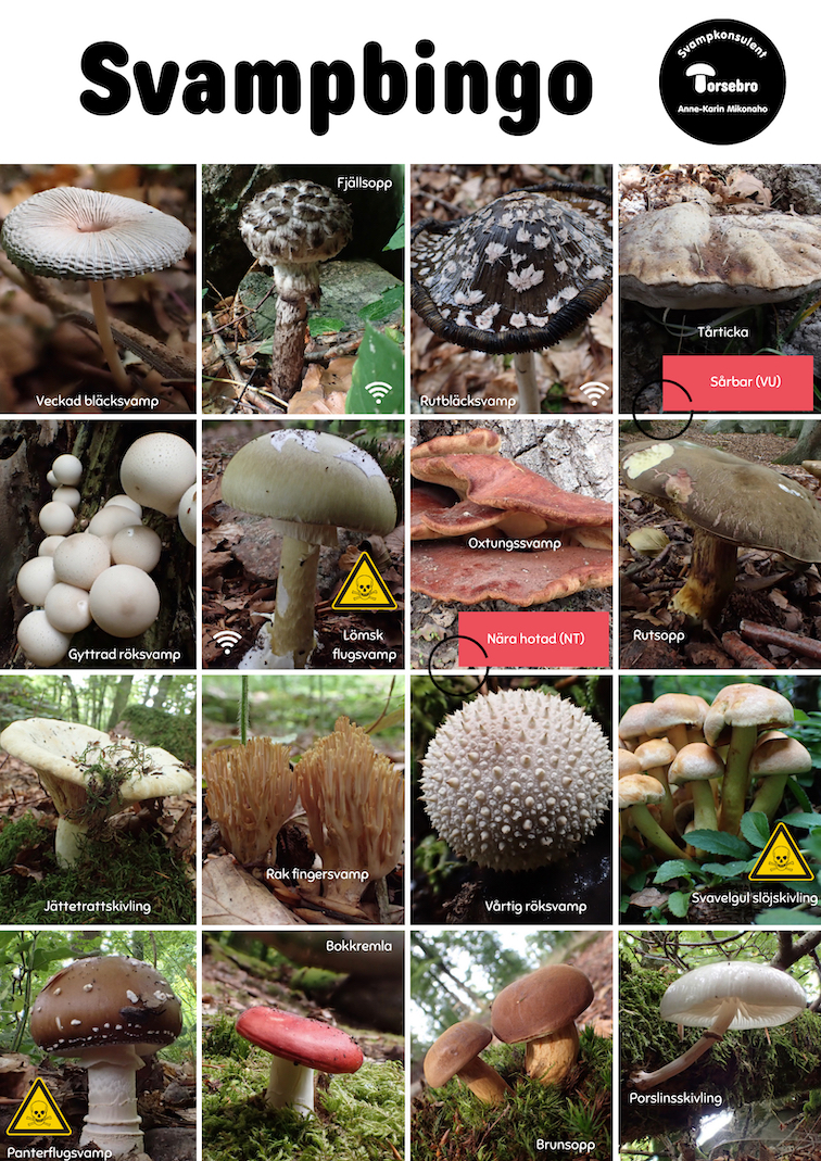 Förutom matsvamp är giftsvampar och förväxlingsarter särskilt viktiga att lära sig. Men vad menas med naturvårdsarter, rödlistade arter, signalarter och indikatorarter? Ett svampbingo är ett kul sätt att lära sig mer.